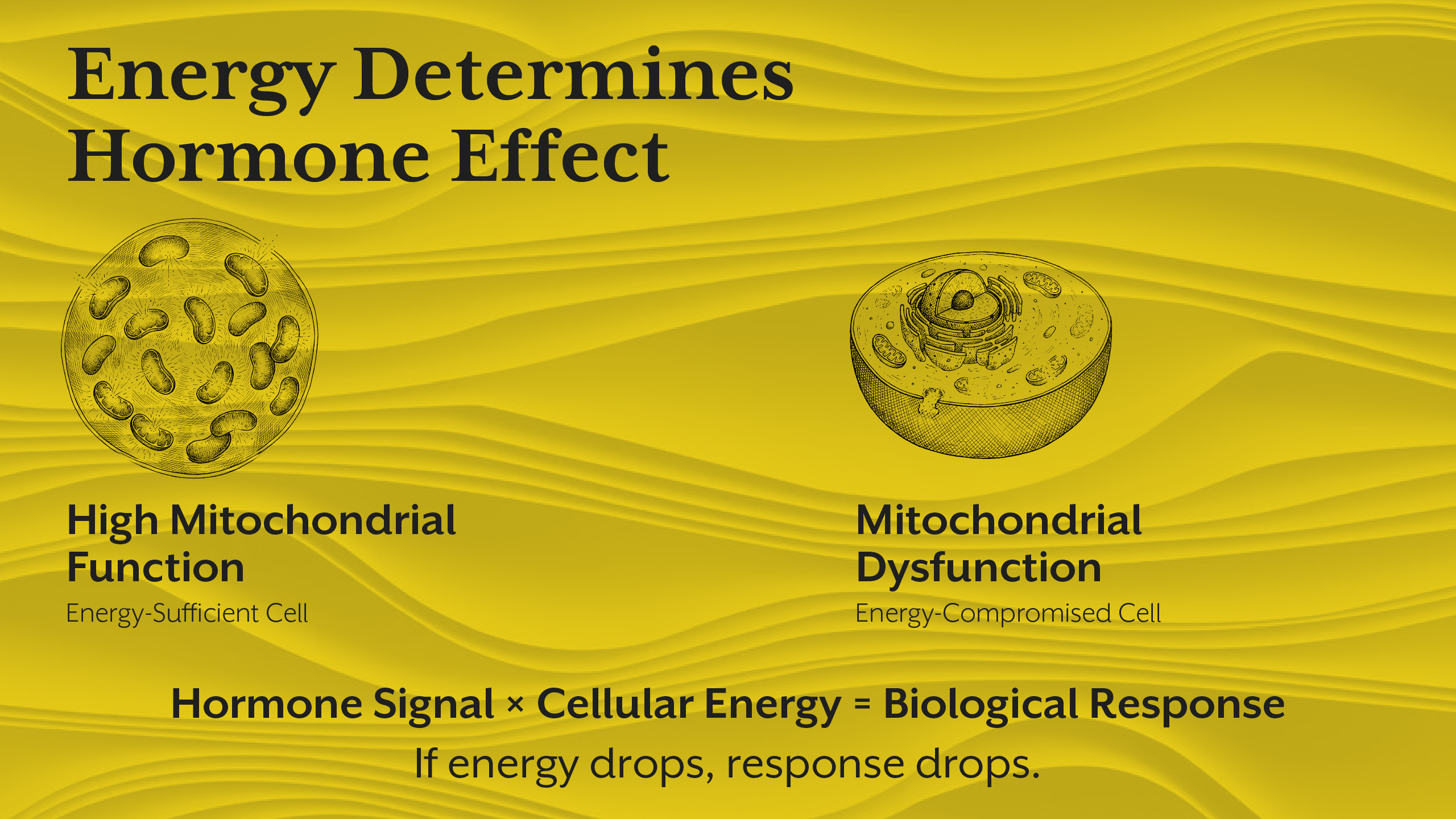 Mitochondria determine how effectively cells respond to hormonal signalling. Even with adequate hormone availability, low mitochondrial efficiency reduces tissue responsiveness.