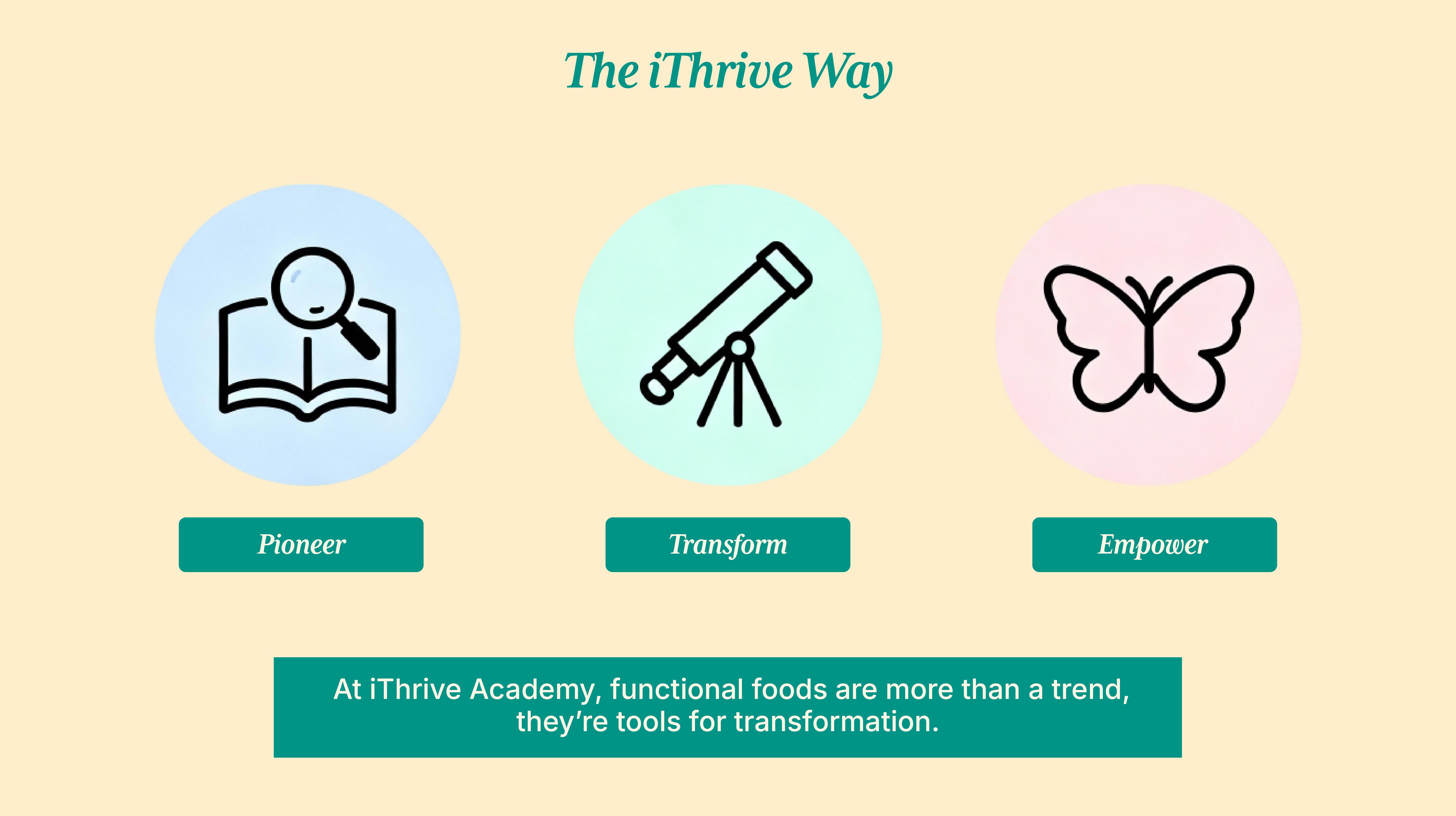 At iThrive Academy, we see functional foods as more than just any growing trend, they are viewed as tools for transformation, but only when understood thoroughly and applied correctly. That’s why our approach rests on the core three pillars that are Empower, Transform, and Pioneer.