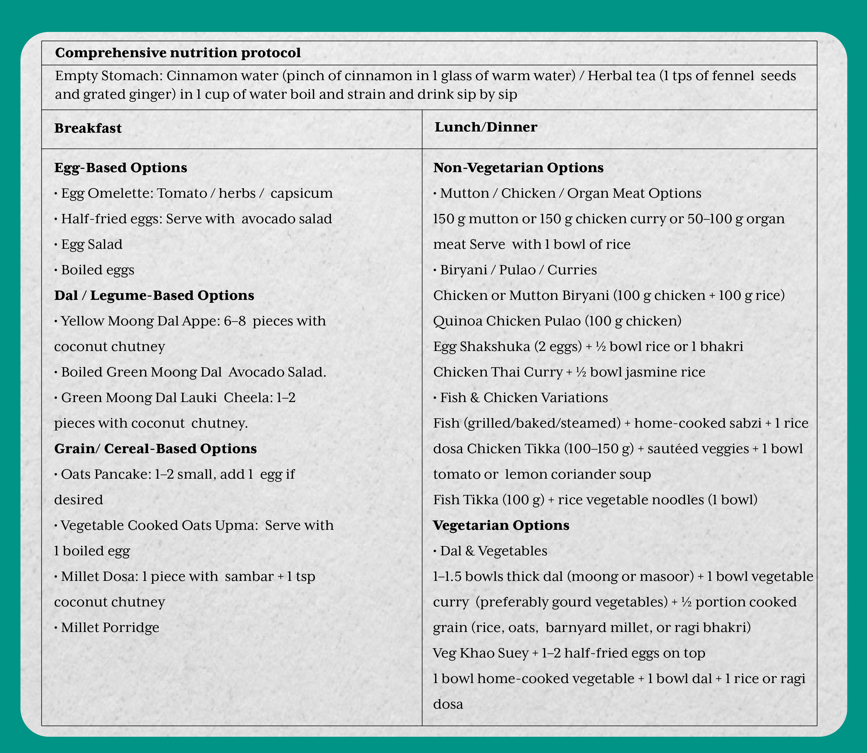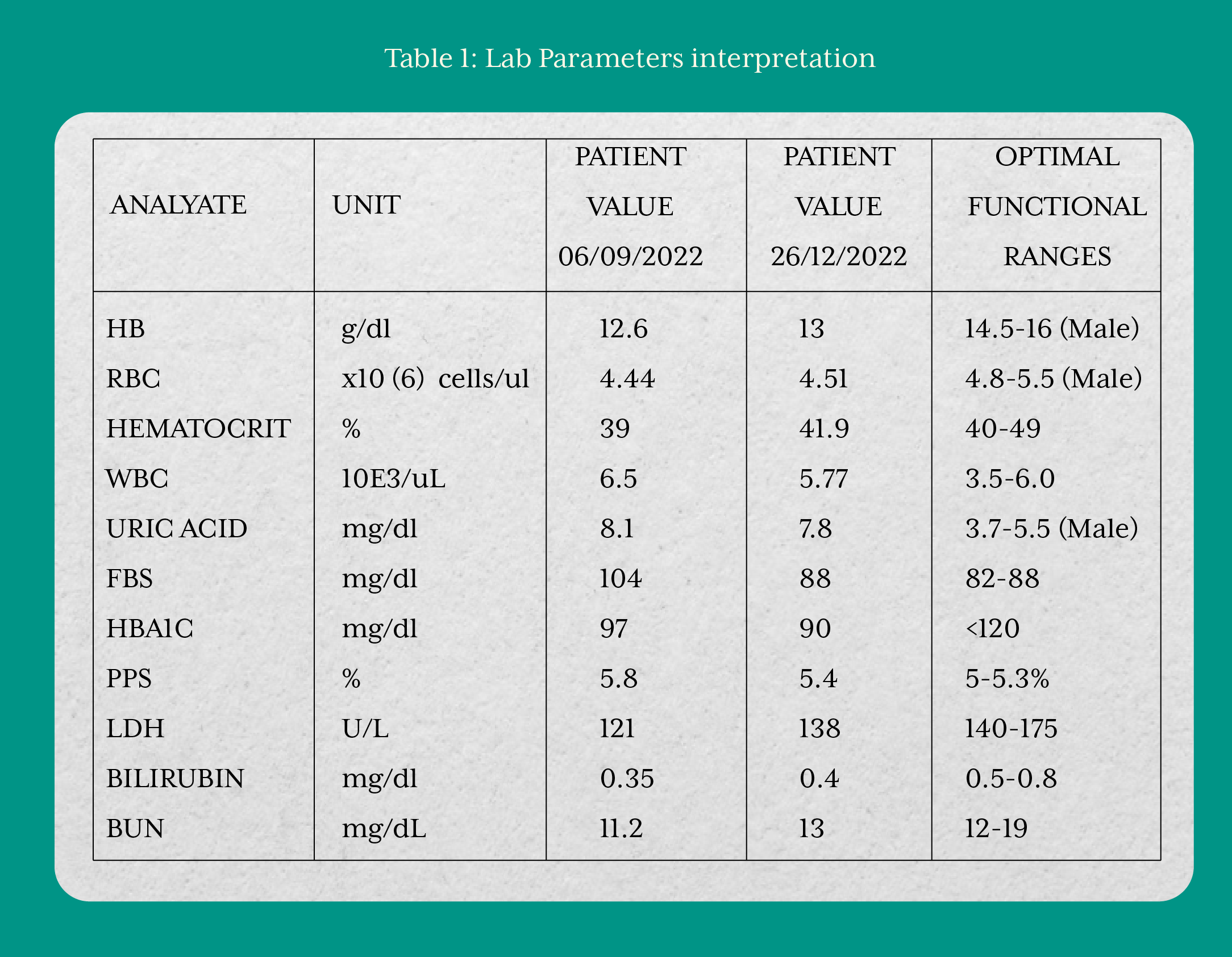 On September 1, 2022, the patient enrolled in the Functional Nutrition Program at Thrivetribe Wellness Solutions Private Limited and provided written informed consent to initiate the intervention. A comprehensive laboratory evaluation performed on September 6, 2022, revealed significant derangements in hematological and metabolic parameters. Red blood cells (RBC) count, hemoglobin, hematocrit, and white blood cells (WBC) levels were abnormal, indicating impaired hematopoietic and immune function. Glycemic markers including fasting blood sugar, hemoglobin A1c (HbA1c), and postprandial sugar were elevated, reflecting poor glucose regulation. Renal (BUN) and hepatic (bilirubin) markers were disturbed, suggesting compromised detoxification and excretory function. Thyroid dysfunction, along with elevated markers of chronic infection and systemic inflammation, were also evident. As the patient had been on long-term steroid therapy, autoimmune status could not be fully established from laboratory investigations alone, warranting further evaluation.