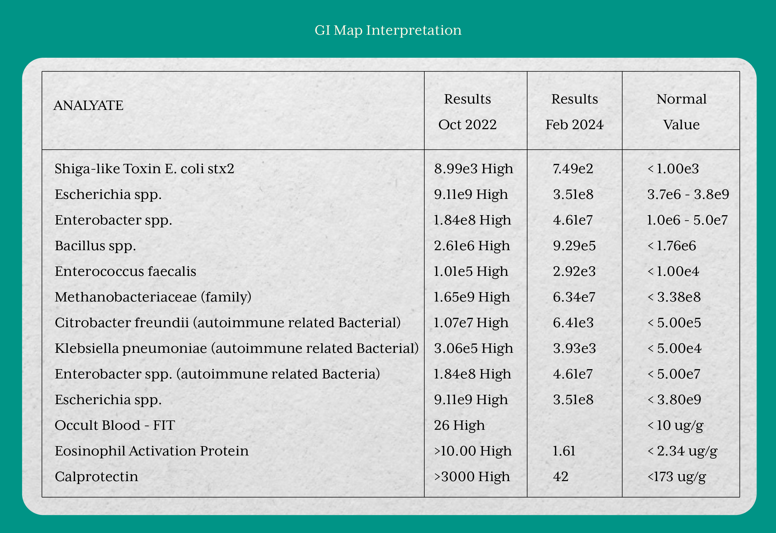 In October 2022, the GI-MAP revealed pronounced gut dysbiosis with overgrowth of several pathogenic and autoimmune-associated bacteria. Inflammatory markers were markedly elevated, with calprotectin exceeding 3000 µg/g, eosinophil activation protein >10 µg/g, and a positive fecal occult blood test, all consistent with severe intestinal inflammation and active mucosal damage in ulcerative colitis.